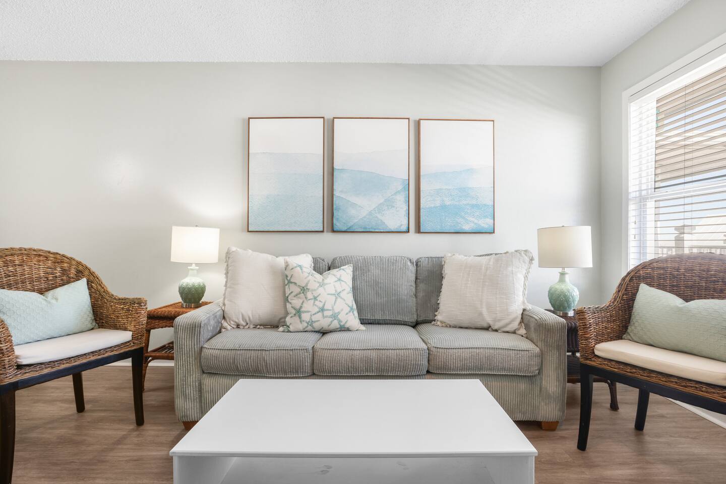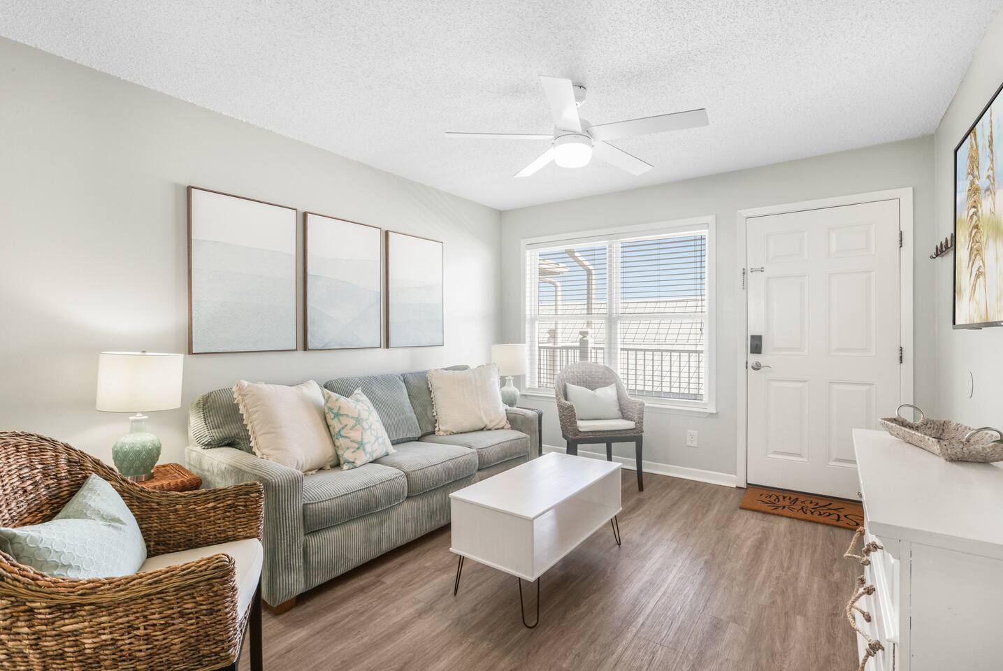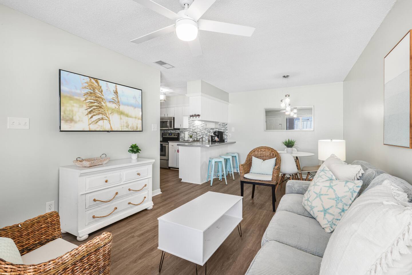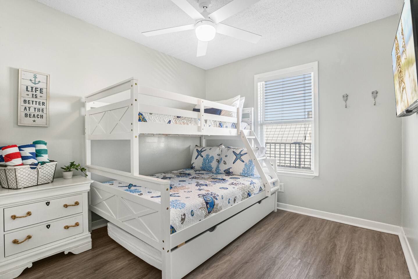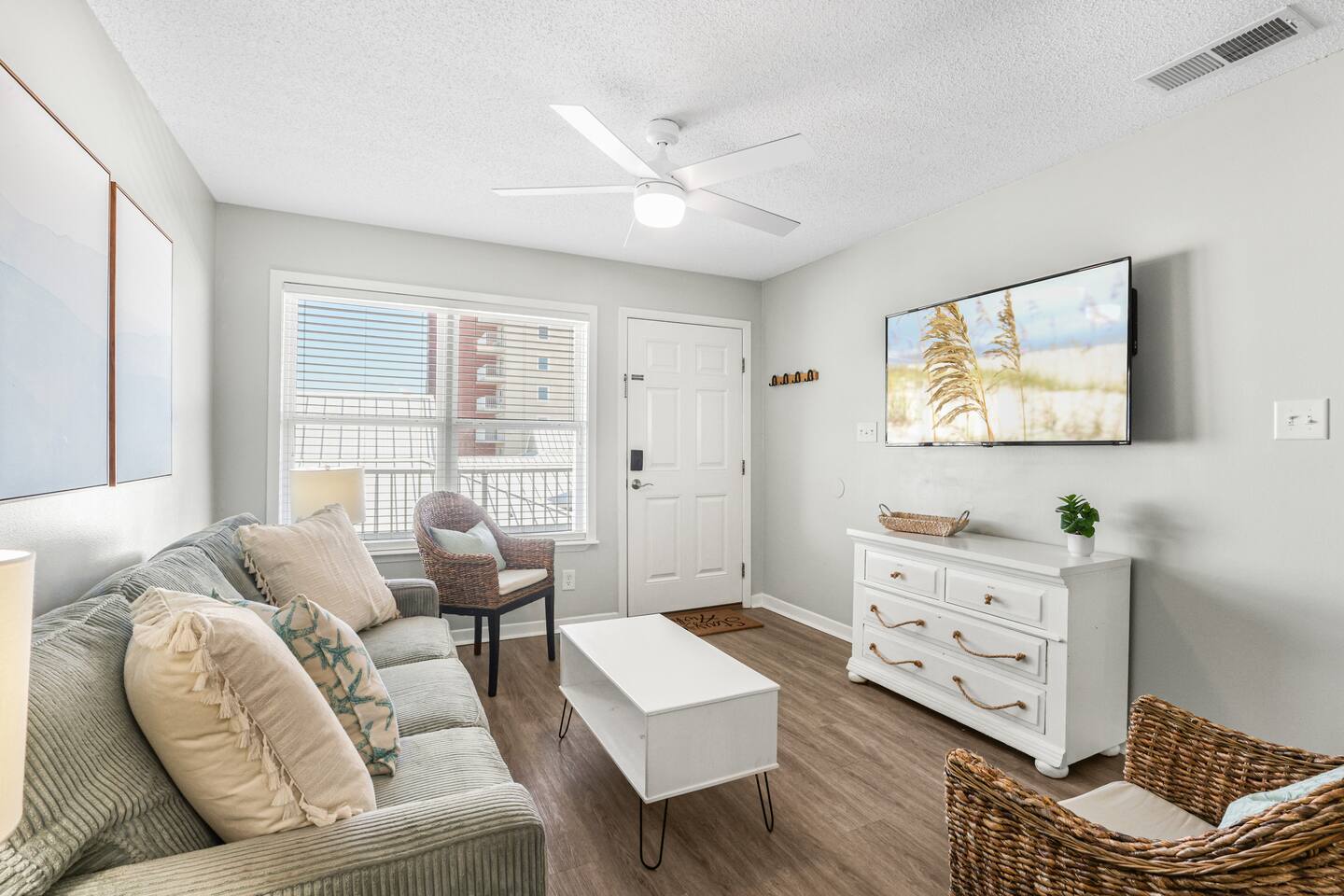 Welcome to the newly updated beachfront getaway on West Beach in Gulf Shores. This 2 bedroom condo comfortably sleeps up to 6 guests and offers beautiful Gulf views with direct beach access just steps away. Step out onto the balcony to listen to the waves or relax inside with smart TVs and inviting spaces designed for your comfort. Enjoy easy access to the community pool just a short walk from your door. Everything you need for a memorable beach vacation is right here. 🛋️ Living Area - Plush sofa and two accent chairs - 55” Smart TV (bring your own streaming logins) 🍽️ Dining & Kitchen - Table for 4 + 3 bar stools - Full kitchen with stainless steel appliances - Keurig, drip coffee maker, hot water kettle, toaster, blender - Complimentary starter set of K-Cups and tea bags 🛏️ Sleeping Arrangements - Bedroom 1: King bed + Smart TV - Bedroom 2: Twin/Full bunk bed + Twin trundle + Smart TV - Living Room: Queen pullout sofa - Linens, pillows, and extra blankets provided 🧸 For Children - Plastic dishes, cups, and utensils - Small assortment of toys, games, and sand toys 🏖️ Beach Access & Amenities - Direct beach access just down the stairs - 2 beach chairs, umbrella, beach towels, and toys included 🏊 Pool & Hot Tub - Small community pool (heated Oct-Apr, weather permitting) - Hot tub available year round - No lifeguard on duty 🔥 Grill Area - Shared charcoal grill near pool/beach access - Charcoal and supplies NOT provided 🚗 Parking - One assigned parking space for one vehicle - Visitor spots (3) will be unavailable after Labor Day 2025 due to construction 🚧 Complex Construction – Starting After 9/1/2025 The southern building of the complex will undergo exterior maintenance. - Your unit is in the northern building (fully operational) - Your assigned space remains unaffected - Beach access, interior amenities, and balcony are all fully available - Occasional weekday noise may be heard from southern building work 📋 Important Notes - No elevator at the complex – Unit is on the 3rd floor. Guests must be able to walk up three flights of stairs. - 24-Hour Cleaning Guarantee: Let us know within 24 hours if anything isn’t perfect and we'll make it right. - Must be 21 to book - Travel insurance recommended for bookings March–October. Refunds are not provided for inclement weather, beach closures, or marine life. - We provide a starter supply of incidentals. To start your stay, we provide one of each of the following: toilet paper roll per bathroom, paper towel roll, laundry pod, dishwasher pod, trash bag per can, dish soap.